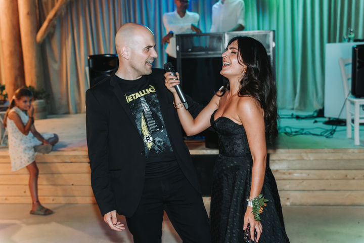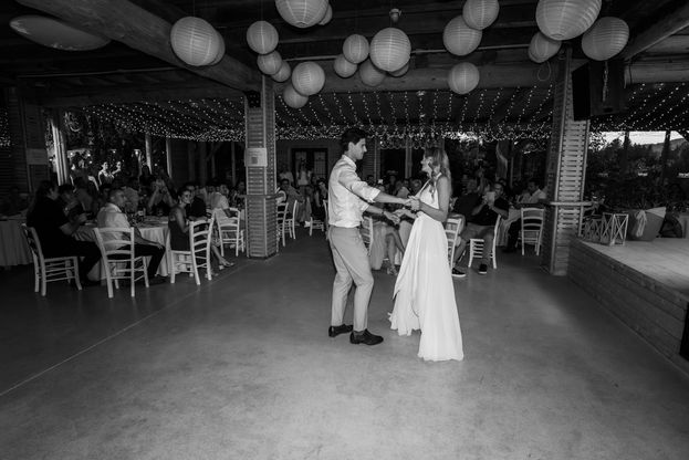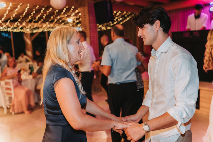 The ceremony took place outdoors in a landscaped courtyard, while the celebration continued in covered areas decorated in a warm, rustic style. The privacy gave a special charm because there was no city noise or traffic, so the guests relaxed and enjoyed themselves until late at night.