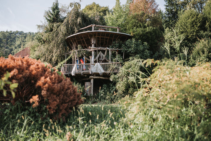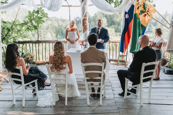 The wedding took place at Čuden Ranč, a rustic estate located in the natural surroundings of Slovenia. The estate was outside the urban areas, surrounded by forests, meadows and gentle hills, which created a peaceful and intimate atmosphere.